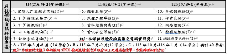 ●修讀學分:40學分。(※課程結束後3年內檢附APCS檢測達(含)6級分以上通過成績方能辦理加科登記。)