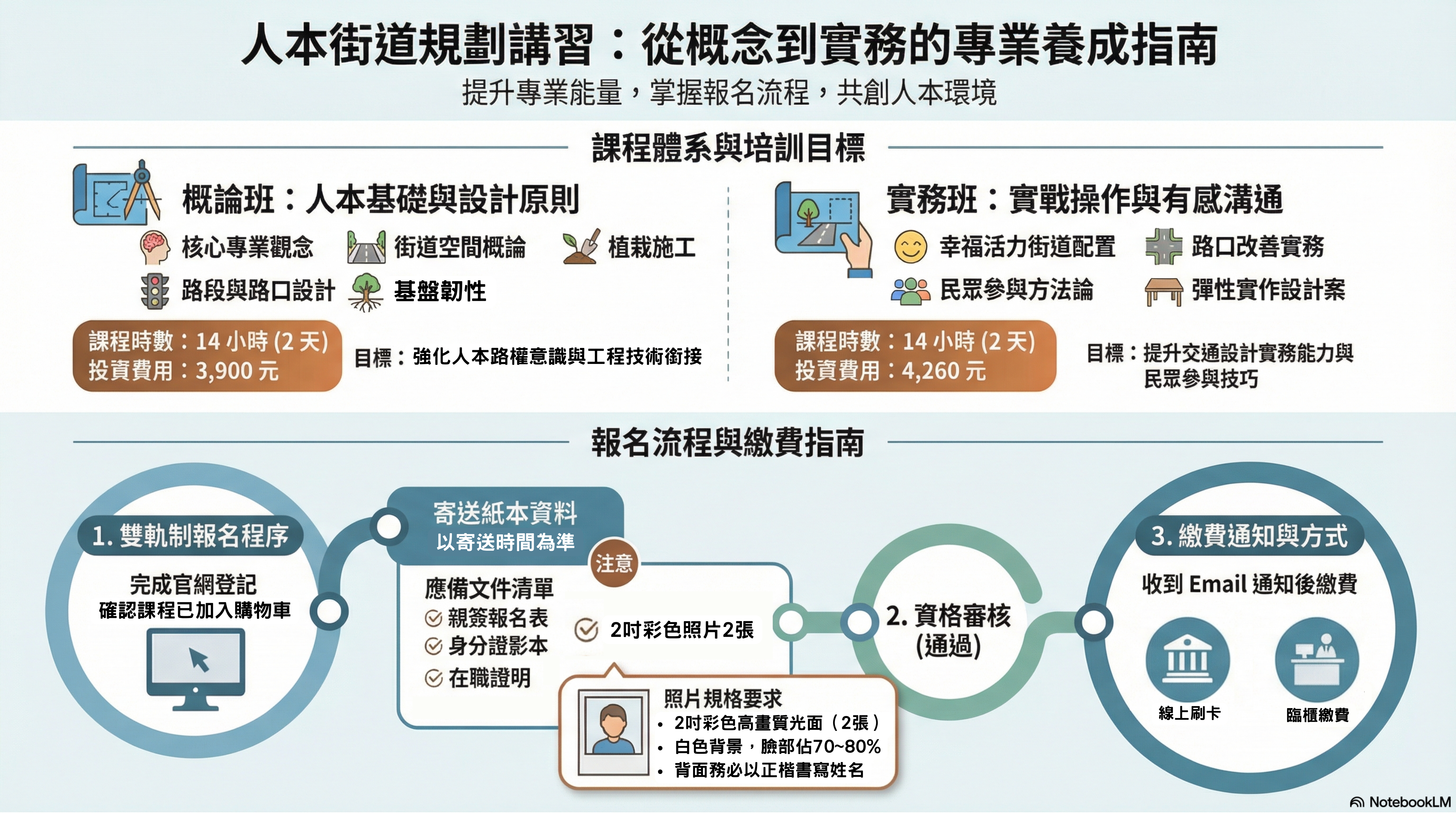費用:人本街道概論班-每人新台幣3,900元。人本街道實務班-每人新台幣4,260元